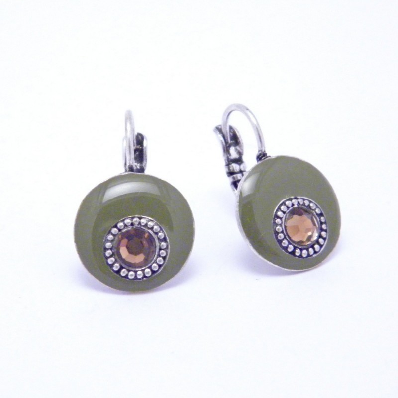 Boucles d'oreilles fantaisie émaillées vertes et ornées de 1 strass marron